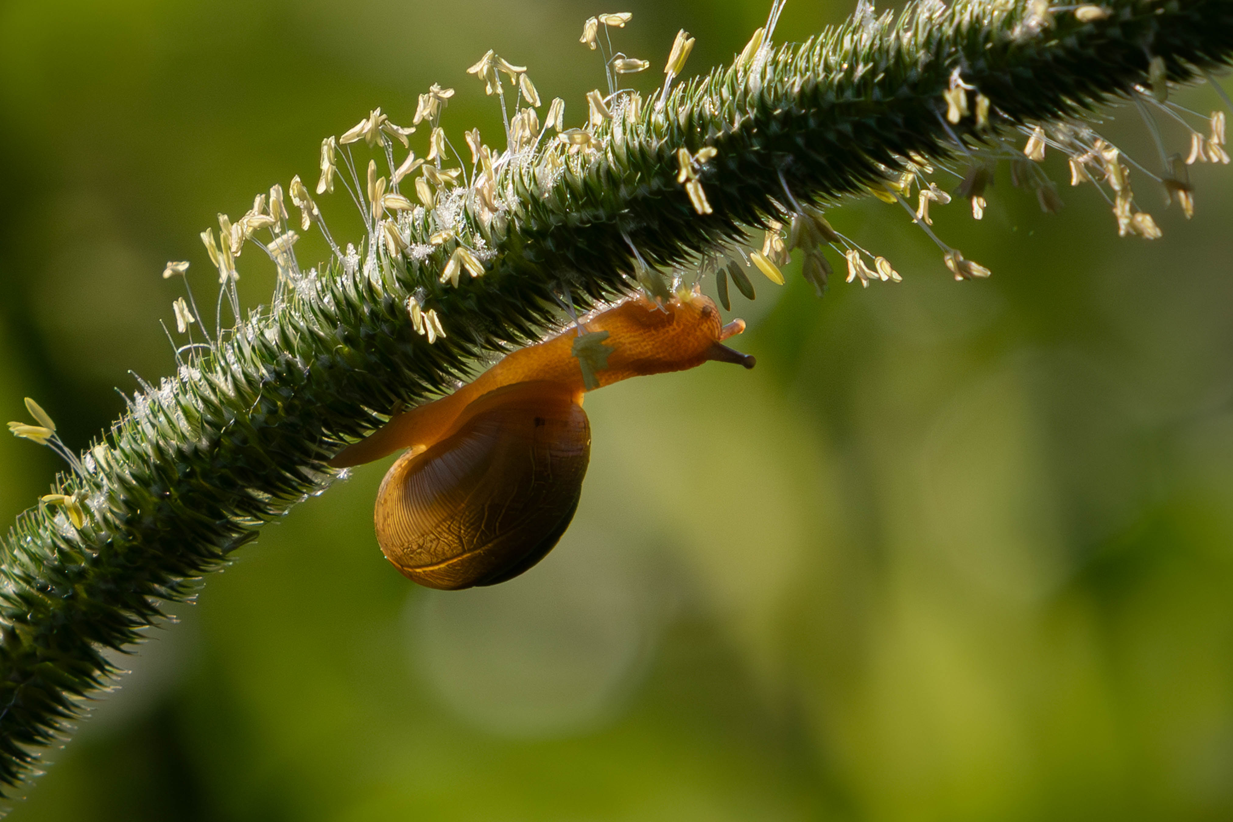 Behind the Shot: It was a spectacular June morning as the golden sun, still low on the horizon, backlit the flowering grasses in the field along the Lookout Trail. The tufts of glowing grasses were beautiful in themselves, but an additional golden adornment caught my attention: a snail was hanging upside down on a flower head, defying both gravity and my expectations about surfaces suitable for snail mobility! Photographs of this amazing snail were taken from a number of perspectives using a handheld Canon DSLR, but the translucent snail being backlit by the sun easily emerged as the strongest composition conveying the wonderfulness of this moment. As J. S. Bach often initialized his work, S. D. G. - Soli Deo gloria!