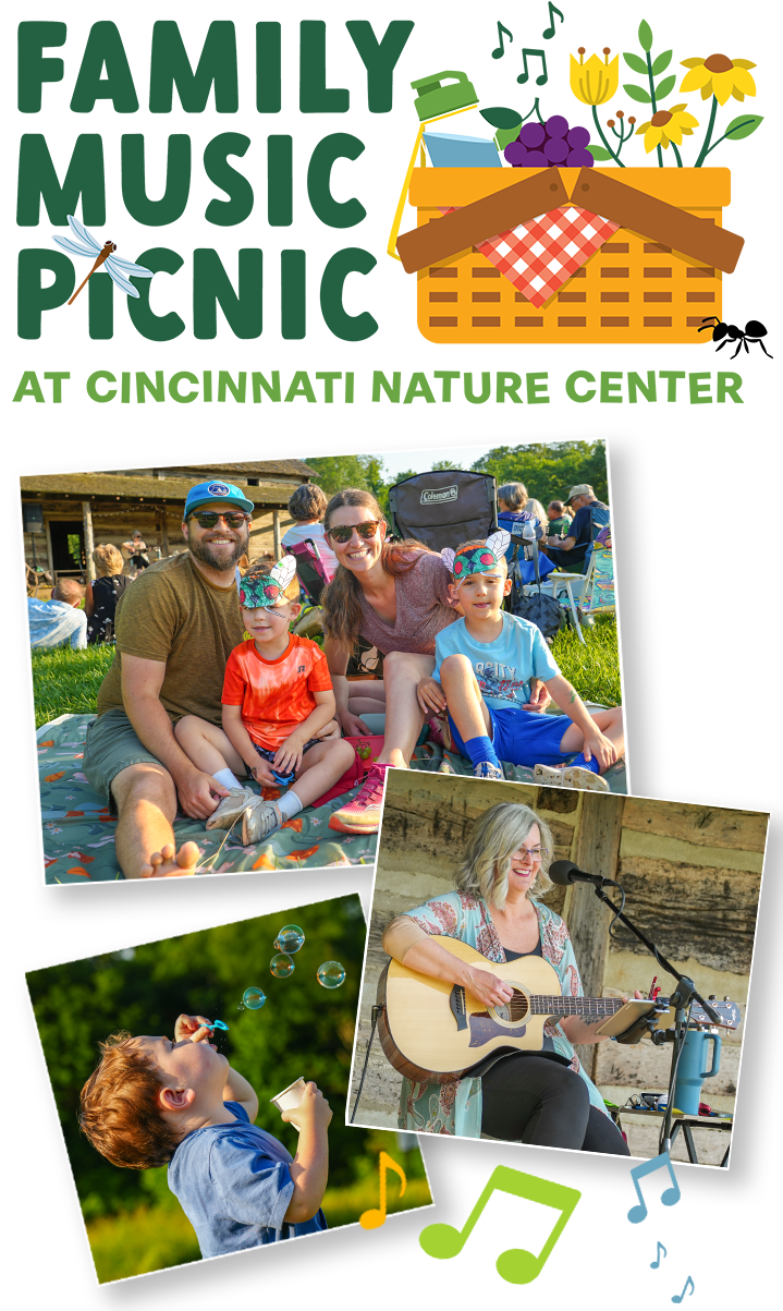 Family Music Picnic takes place at Cincinnati Nature Center’s main Rowe Woods location in Milford, Ohio (4949 Tealtown Rd). Specifically, the event will be held in Oak Allee, which is near Rowe Visitor Center. This is a large, shaded area. Our Gatehouse staff and parking attendants will help guests find the event location.